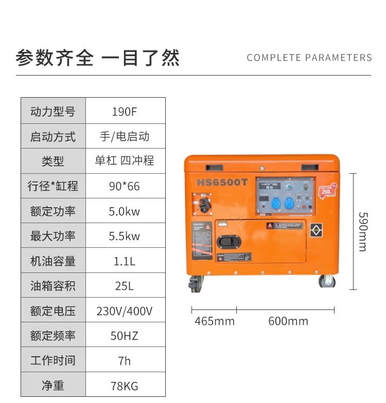 - 翰丝静音发电机组5KW8KW10千瓦220V户外应急防汛备用移动供电HS6800T