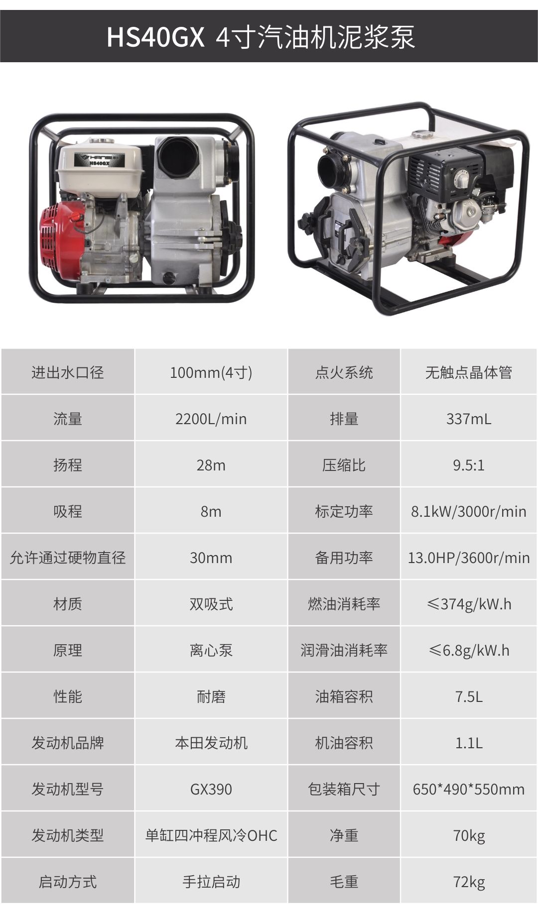 - 翰丝GX390动力大流量汽油机排污泵4寸100m³/h 风冷389cc排量HS40GX